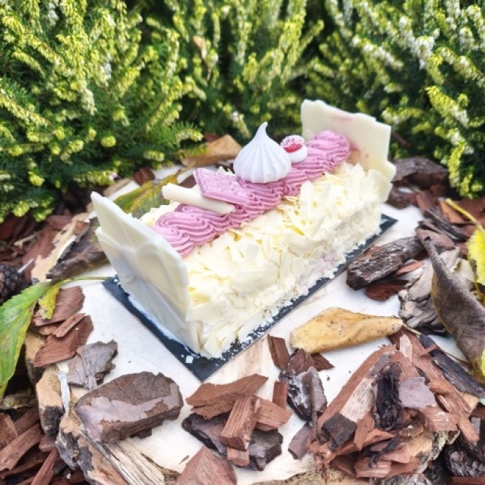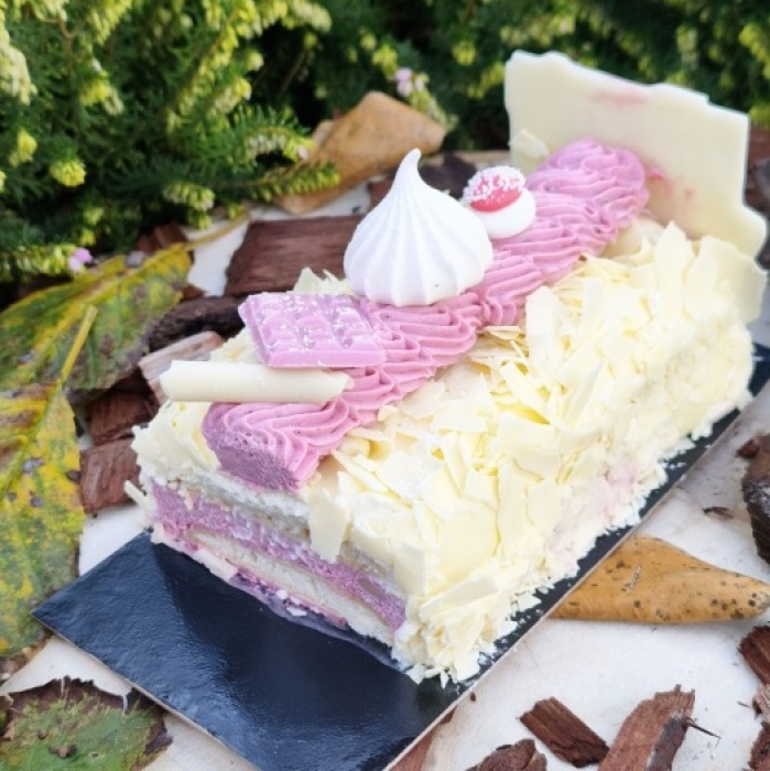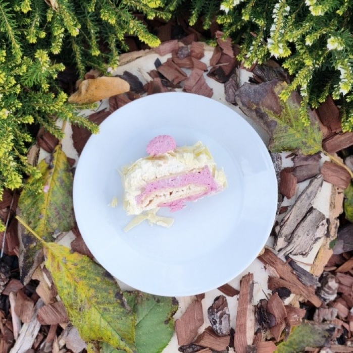 Meringue, mousse framboise, mousse chocolat blanc, copeaux de chocolat blanc.