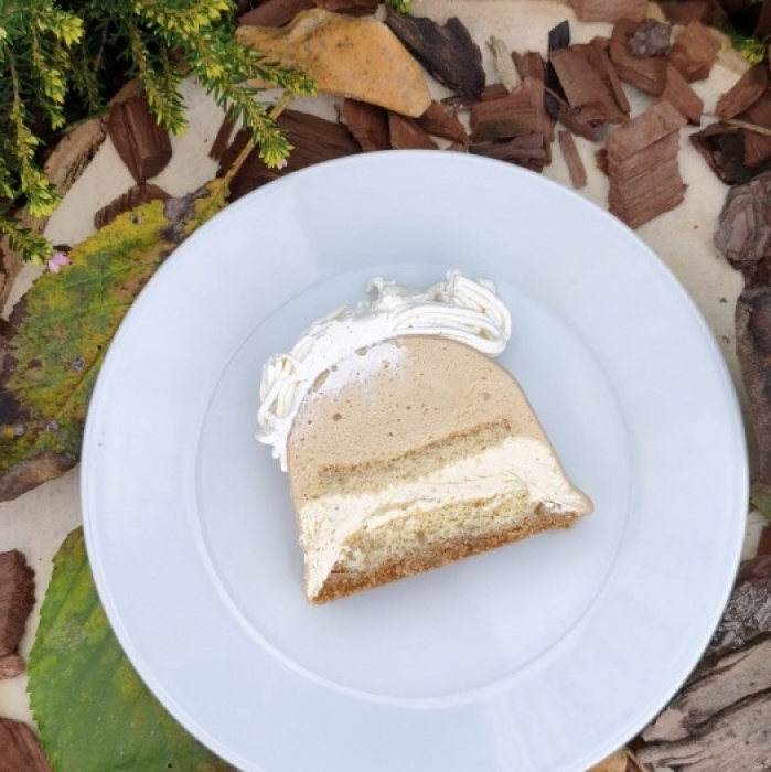 Mousse spéculoos, mousse vanille, biscuit de Savoie, croustillant spéculoos / chocolat blanc.