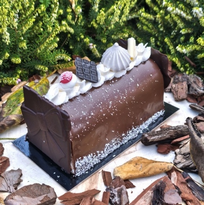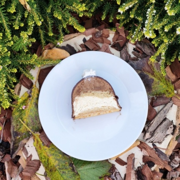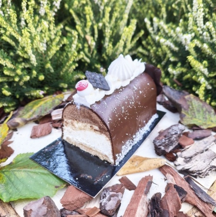 Mousse chocolat au lait, mousse coco, biscuit de Savoie, glaçage chocolat noir,