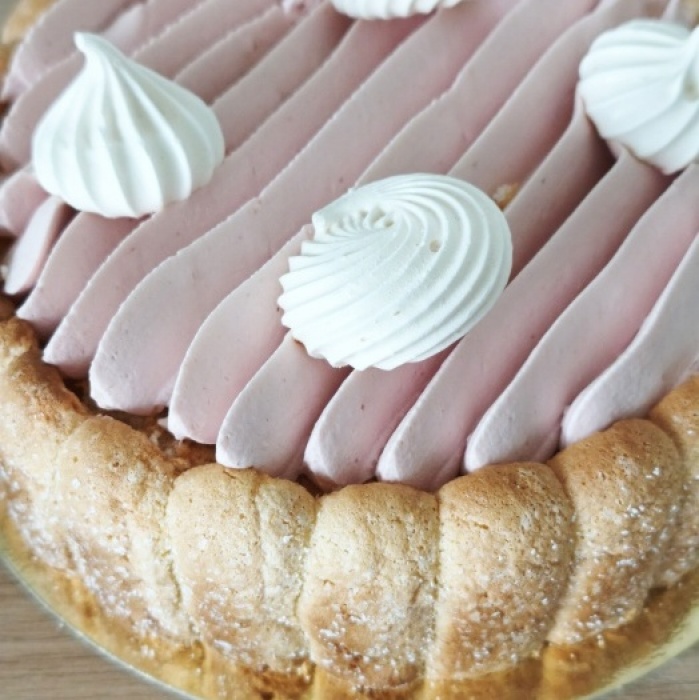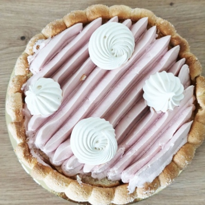 Charlotte à la mousse de fraise, garnie de biscuit de Savoie imbibée d'un sirop vanille et de mousse à la fraise.